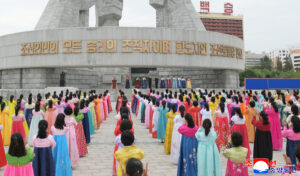 At the meeting of officials and members of the women’s union held before the Monument to Party Founding, the reporter and speakers said that thanks to the outstanding idea and energetic leadership of the respected Comrade Kim Jong Un, the red Party flag held high by the WPK on the very day of the Party founding is more vigorously fluttering as a banner of brilliant victory and glory.