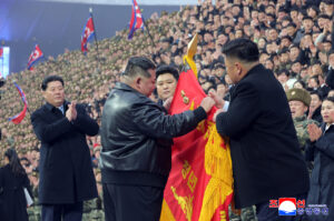 김정은동지께서는 사회주의애국청년동맹기발에 김정일훈장을 달아주시고 청년동맹중앙위원회 위원장에게 훈장증서를 전달하시였다.