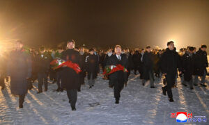 (평양 12월 5일발 조선중앙통신)재일조선학생소년예술단이 4일 만수대언덕에 높이 모신 위대한 수령 김일성동지와 위대한 령도자 김정일동지의 동상을 찾아 경모의 정을 표시하였다.